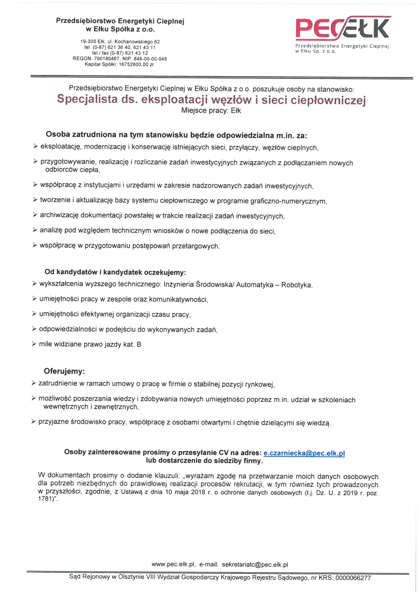 Osoby zainteresowane prosimy o przesyłanie CV na adres: e.czarniecka@pec.elk.pl lub dostarczenie do siedziby firmy.